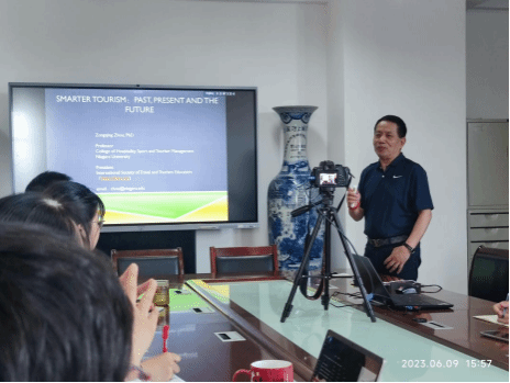 邀请,在博学楼9层学院会议室,美国尼亚加拉大学终身教授周宗清博士做了题为《Smarter tourism:Past, present and the future》的学术报告。会议由院长弓志刚教授主持,学院相关专业教师,硕士研究生和博士研究生,以及部分本科生参加了学习。