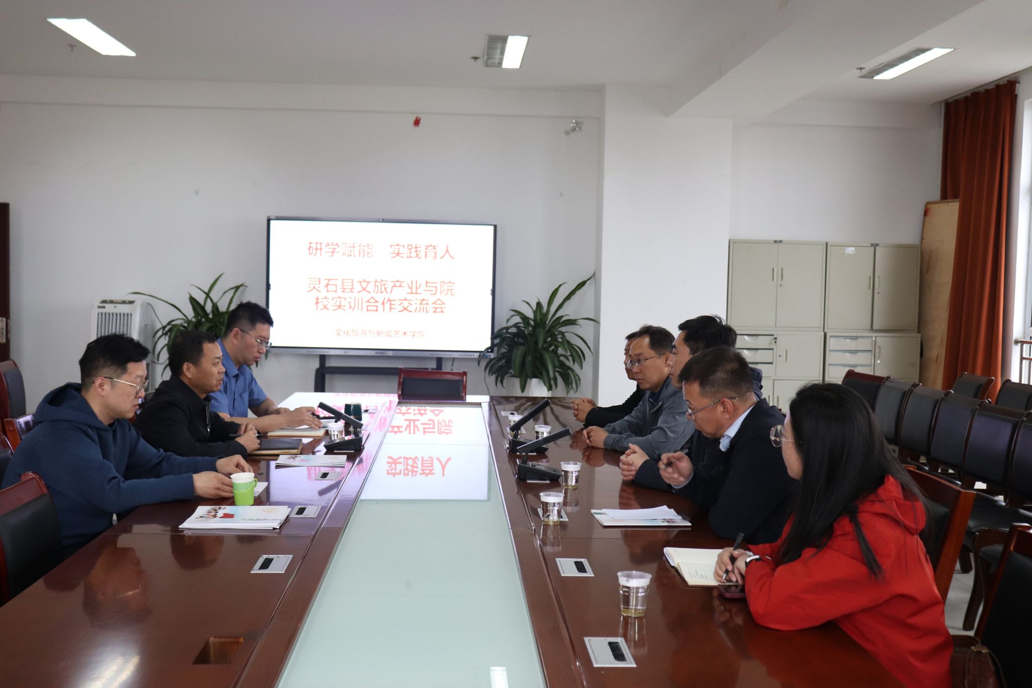 程占红院长详细介绍了学院学科优势和发展情况。他指出,学院将实训基地合作、讲解员队伍培训、研学课程设计、产教融合项目等方面,助力灵石文旅产业提质升级。马慧强副院长补充,将结合灵石王家大院、石膏山、红崖峡谷等核心资源,设计“文化溯源+生态研学+数字营销”实践教学模块,为学生提供“沉浸式”成长平台。