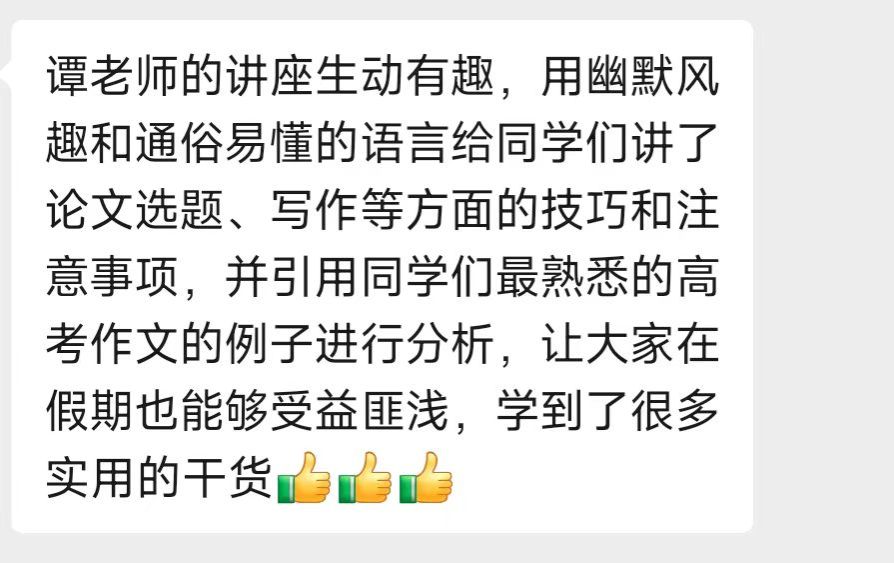 “谭老师的讲座生动有趣,用幽默风趣和通俗易懂的语言给同学们讲了论文选题、写作等方面的技巧和注意事项,并引用同学们最熟悉的高考作文的例子进行分析,让大家在假期也能够受益匪浅,学到了很多实用的干货。”王泽宇同学如是说。