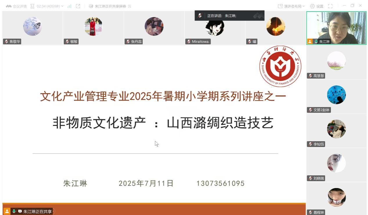 文化产业管理专业以线上腾讯会议形式,开展“非物质文化遗产:山西潞绸织造技艺”专题教学活动。主讲人朱江琳老师携手张黎敏、李旭鹏等全体教研室教师,为2022级、2023级、2024级学生剖析非遗保护传承路径,深化专业学生对传统文化传承的认知。