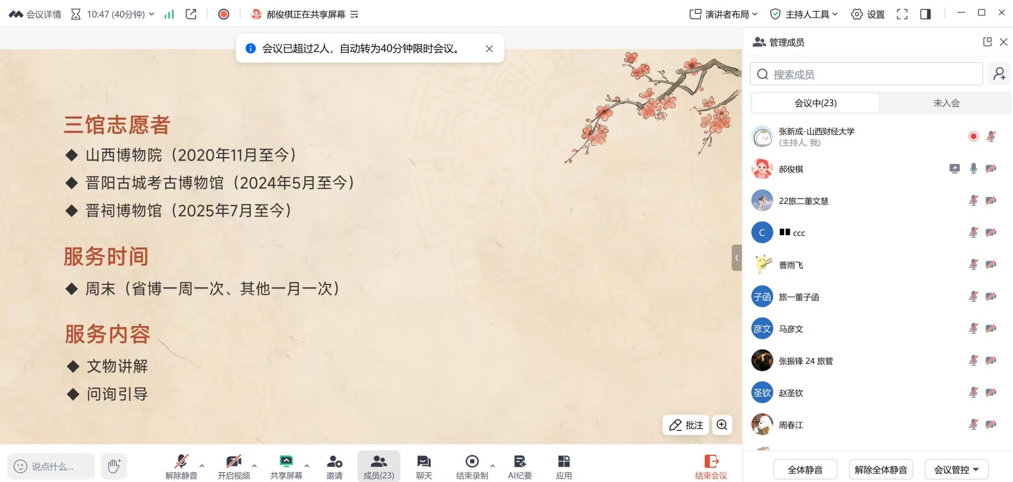 旅游管理专业以线上腾讯会议形式,开展《在博物馆,遇见另一个自己——回顾我的文博志愿经历》的专题活动,主讲人为山西省省级机关服务中心(有限公司)郝俊棋,为2022级、2023级、2024级学生分享博物馆志愿者经历。