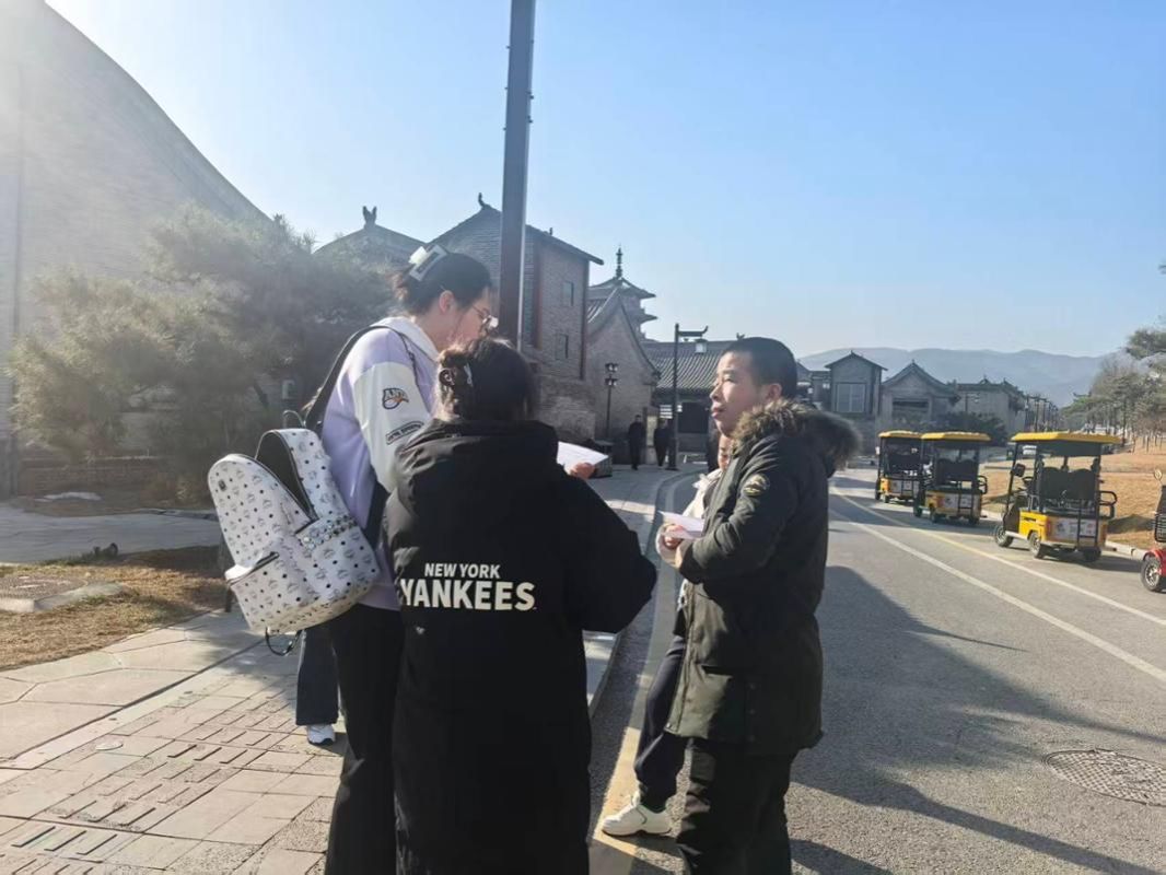 随后,实践团队走进太原古县城,聚焦“文化产业赋能乡村振兴”核心主题开展实地调研。同学们分组行动,面向商户、游客、本地居民及文化产业从业者发放调查问卷,耐心询问古城文旅发展现状、非遗传承路径及乡村增收实效等问题,认真记录各方对文化资源活化、产业融合发展的意见建议,在面对面交流中收集到丰富的一手资料。