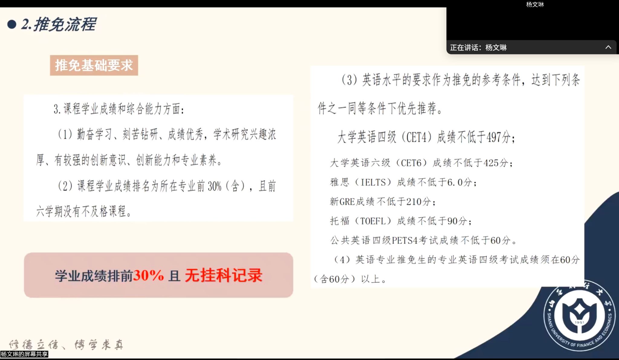 本校保研的基本门槛是专业排名前30%且前六学期无不及格课程,综合成绩由学业成绩(80%)、科研创新能力(10%)与荣誉奖励(10%)构成。时间规划上,前三年需维持高绩点并参加四六级、竞赛及实践活动;大三暑假(6-8月)是申请并参加夏令营的关键期,需提前准备材料投递目标院校;大四9月中上旬申请本校推免资格,经审核、答辩与综合评议后获得推荐资格;9-10月参加目标院校复试完成录取。她特别强调各环节时间节点紧密衔接,需主动关注研究生院官网通知。